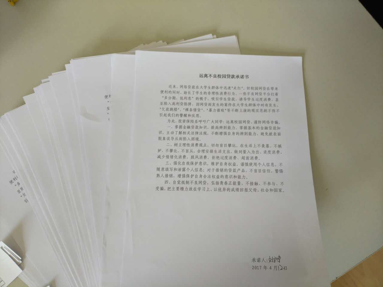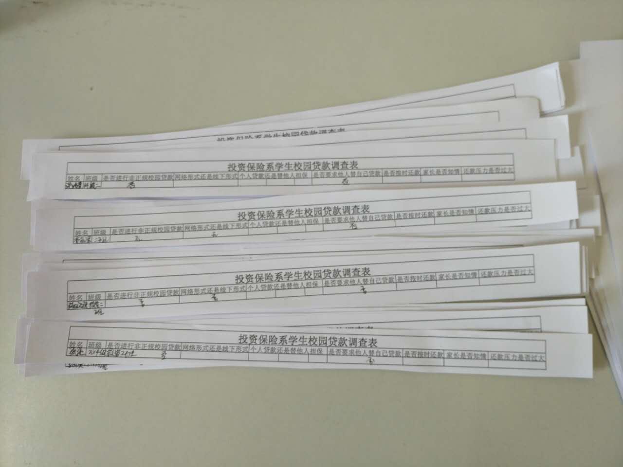 排查过程中,各位老师与学生之间分工明确,统筹兼顾,积极完成排查工作。学生会新闻部利用系微信公众平台进行了三次的远离不良校园贷的宣传,发挥好网络思想政治教育的时效性。各位辅导员老师利于班委会、寝室长会议等形式,传达排查整治校园贷款的工作精神,做好相关工作的动员,并对可能遇到的重点难点问题进行缜密部署。各班级班干积极组织学生填写《投资保险系学生校园网贷调查表》、《远离不良校园贷款承诺书》,认真总结排查结果,如实向系里反馈。