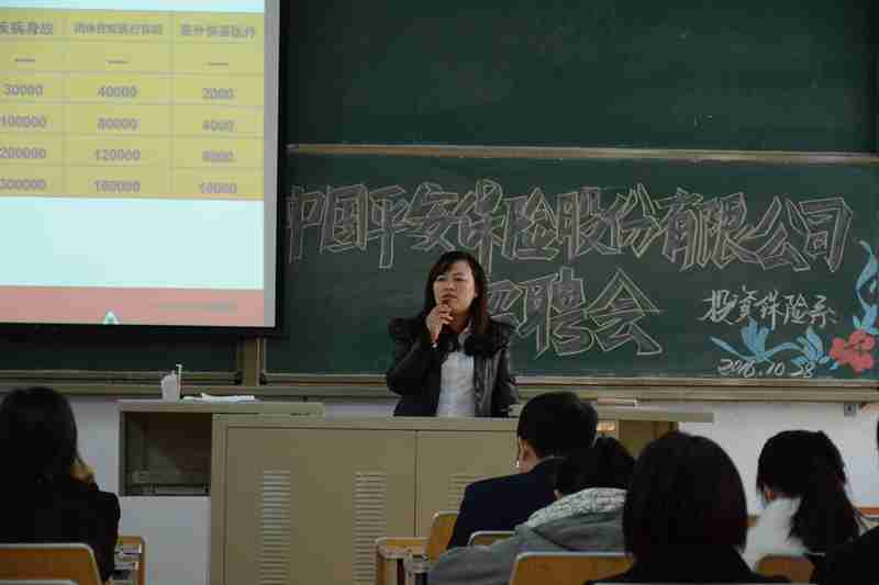 为了向同学们提供优质就业服务,提高毕业生就业率,投资保险系联合平安人寿保险公司于2016年10月28日在实验楼102举办了专场招聘会,2014级辅导员贲庆福老师出席了本次招聘会,平安人寿的洪经理主持此次会议。