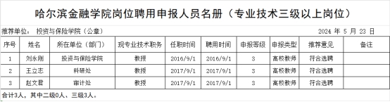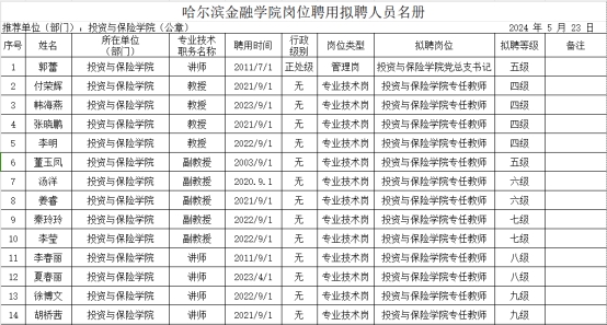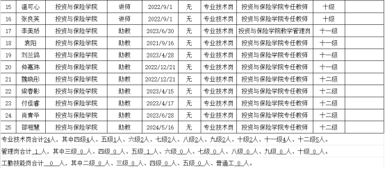 根据我校第二轮岗位聘用工作安排,为做好我院专业技术岗位设置管理的具体实施工作,我院成立了岗位设置管理工作小组,制定《投资与保险学院第二轮教师岗位聘用工作实施细则》,公布各级岗位名额。教师提交报名表及佐证材料,学院专业技术岗位评议小组组织资格审查并进行评审投票,确认推荐人选,投资与保险学院党总支委员会进行思想政治及师德师风把关,党政联席会审议,现将我院第二轮教师岗位聘用结果进行公示。