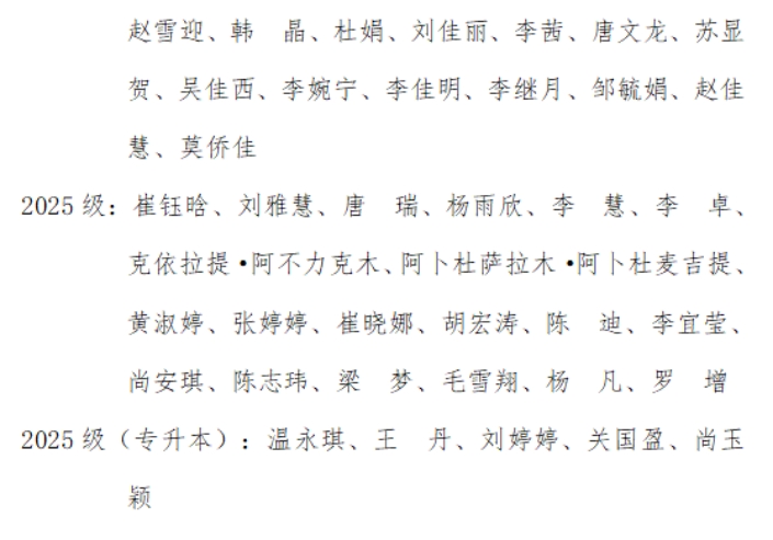 根据国家及省有关文件精神,投资与保险学院开展2025-2026学年度秋季学期国家助学金的评审工作,依据《哈尔滨金融学院国家助学金评审实施细则》(哈金院〔2019〕144 号),及本次家庭经济困难学生认定结果,经过学生个人申请,本着公平、公正、公开的原则,对申请学生进行审核,经学院研究决定,拟推荐171人为2025-2026学年度秋季学期国家助学金获得者,名单公示如下: