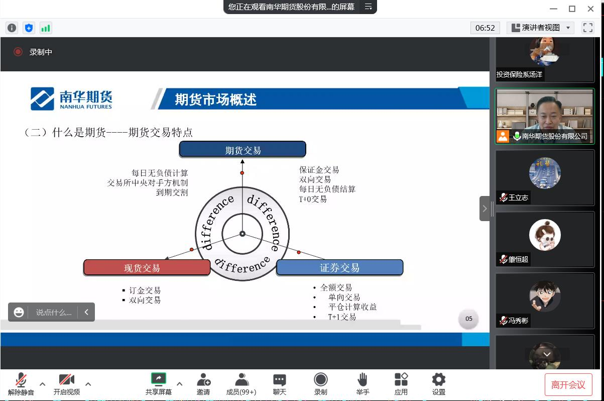 2022年9月28日,投资保险系领导、投资学教研室全体教师以及投资学专业共280余人,参加了由郑州商品交易所支持,南华期货股份有限公司主办的“期货知识进校园”哈尔滨金融学院专场活动,邀请了横华农业首席分析师徐明老师,为老师和同学们带来期货市场发展情况及交易规则、“郑商所杯”介绍两场主题演讲。