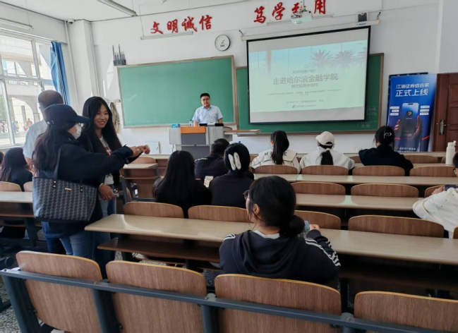 为深化产教融合,助力学生职业启航,2025年9月26日下午13:30,投资与保险学院在综合楼103教室成功举办了主题为“新生代投教中国行——走进哈尔滨金融学院 投资理财伴我行”的学年实习动员会。本次活动特邀江海证券哈尔滨金江路营业部崔总监及其团队莅临现场,为2023级投资学专业学生进行了一场内容丰富、贴近实务的动员与交流。