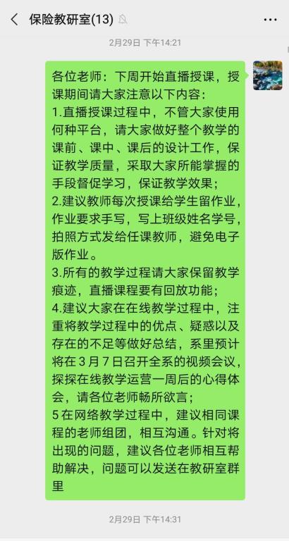疫情期间,为了响应教育部“听课不停教,停课不停学”的方针政策,为保障线上教学工作的顺利开展和保证线上教学的质量,为进一步推进教研室的教学工作,为保证学校评建工作的顺利展开,保险学教研室分别于2月26日、3月4日、3月22日多次召开钉钉视频会议,会议由保险教研室主任秦玲玲主持,保险教研室全体教师参会。