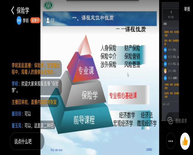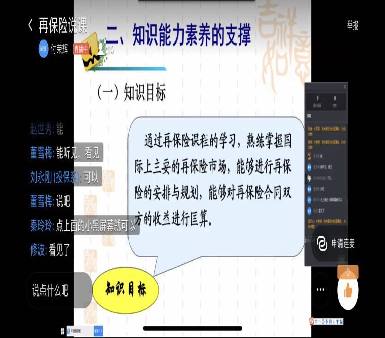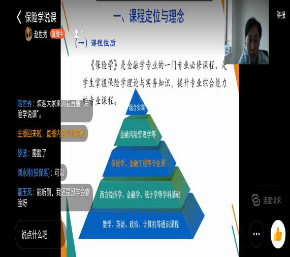 此次参与说课的教师为该学期担任教学活动的付荣辉、刘永刚、李明、董玉凤、赵世秀、秦玲玲、修波的七名教师,新入职的教师刘博、温可心、甘雨田进行了观摩。七位教师结合该学期网络授课的经验,从课程定位、教学目标、教学内容、学情分析、授课方法以及考核方式等方面进行了课程展示,各具特色,独具特点。付荣辉老师从国标的角度对《再保险》课程教学进行了基本讲解,重点和大家分享了网络授课期间基本教学活动的组织;刘永刚老师讲解之初向所有老师秀了一把网络直播授课技术咖,结合自身工作的特点和疫情的特殊性重点向大家介绍了课程思政融入《风险管理》教学的重要性;李明对《保险学》课程的讲解,通过向大家对比了大二金融学专业学生和以往学生不同的学情分析,重点讲解了采用案例教学和线上线下混合教学模式的教学经验;董玉凤老师向大家重点讲解了运用英文原版教材讲解《保险学》课程与我们中文教材讲解的不同之处,同时讲述了运用网络授课能提前将授课材料发送给大家解决教学难点的优势;赵世秀老师向大家展示了通过网络教学可以向学生展示更多有关《保险学》的教学材料,采用智慧树见面课、反转课可以更好的讲解保险学的基础知识,重点向大家展示了线上保险学实验课的授课方式和内容;秦玲玲老师向大家讲解了在《保险中介》的授课过程中,运用专业知识讲解时政热点话题广受学生好评的教学经验;同时分享了借助网络教学的优势能够更好的与学生互动,学生参与度高,结合学生论文指导的经验训练学生写作思维的经验。修波老师向大家展示了如何结合自身保险公司的工作经验和实践经验在《人身保险》的教学过程向学生传授专业知识、工作经验以及上好实验课等内容。