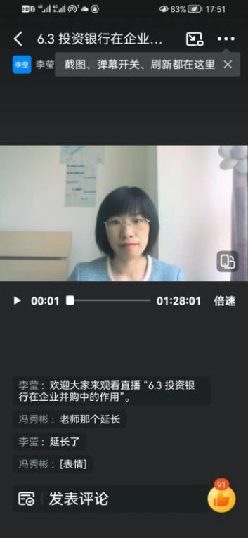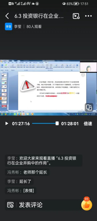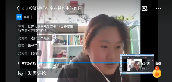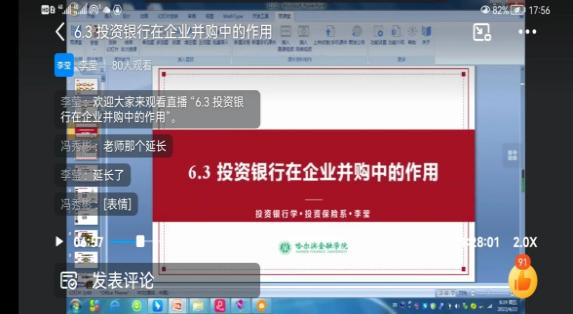 李莹老师以《投资银行学》课程的“投资银行在企业并购中的作用”章节为例,为观摩老师做了线上教学示范。上、下课铃声增加了同学们像线下授课时的那种归属感。在课堂教学过程中,她通过钉钉平台依次发布钉钉上课签到、发布答题卡、抢答、连麦的方式,就教学内容进行实时互动。全课程采用案例教学方式,由浅入深的将教授的内容传递给学生,为了让学生对知识有更好的理解,通过案例视频的方式对教学内容进行剖析。课程观摩不知不觉的进行了45分钟。教师们普遍认为本次观摩课教学设计合理,网络教学资料丰富,讲授语言幽默诙谐,课堂节奏控制得当,课件制作精心,课后作业涵盖了本次授课的主要知识点。利用先抛出问题,让学生带问题去思考案例找寻答案的方式,促进了学生在云端的自主学习积极性,同时还能检验学生的学习效果。