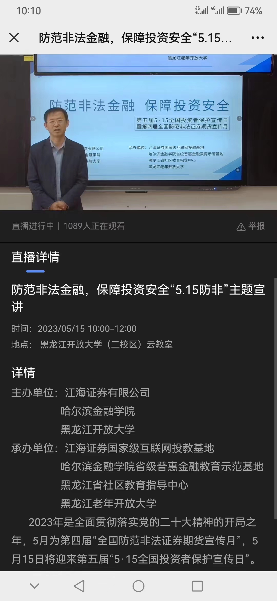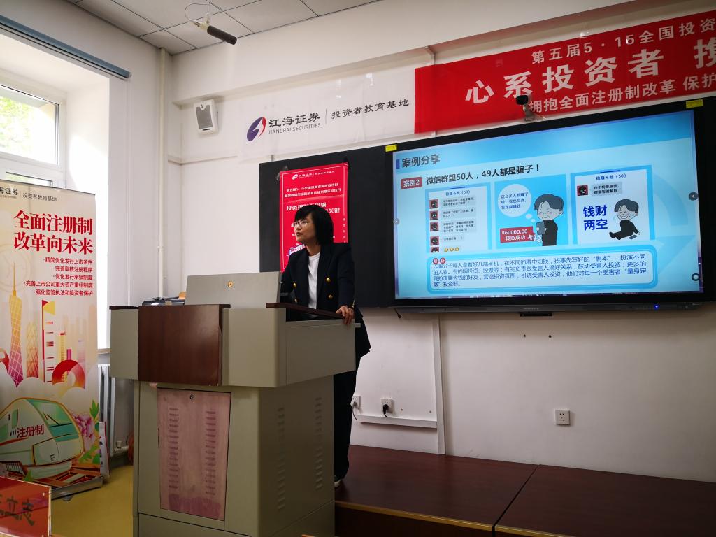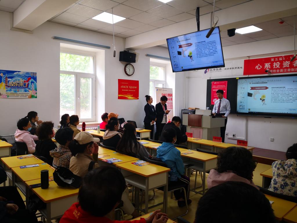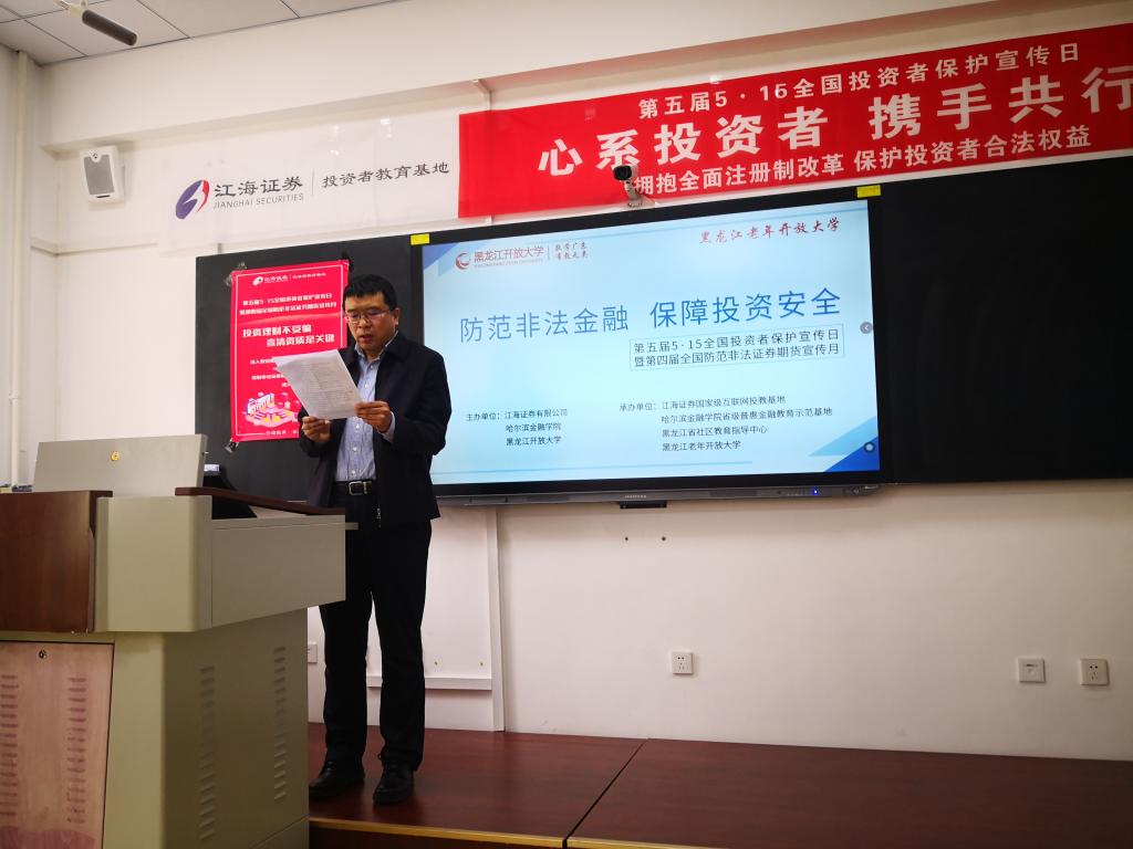 为全面贯彻落实党的二十大精神,我校着力构建金融知识普及长效机制,积极践行保护投资者的合法权益的使命。5月15日上午,我校联合黑龙江开放大学、江海证券有限公司开展开展第五届“5·15全国投资者保护宣传日”暨第四届“全国防范非法证券期货宣传月”活动。黑龙江开放大学副校长张铁军、投资保险系主任王立志、江海证券有限公司金融衍生品部总经理陈锐出席了此次活动。活动采用线上线下相结合的方式,覆盖黑龙江省社区教育指导中心、黑龙江老年开放大学等4000余人。