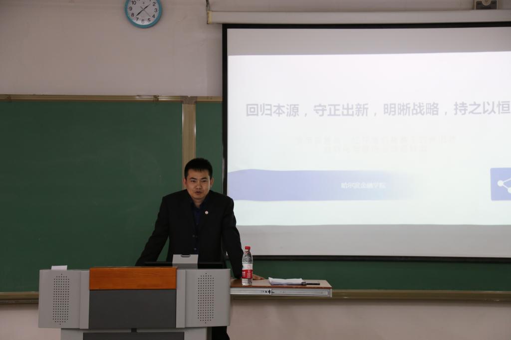 为贯彻落实我国最新经济发展政策,提高我院教师专业教学水平,号召同学们关注身边经济形势,哈尔滨金融学院于2019年4月17日在综合楼101举办中国金融现状分析与未来发展专题讲座,金融系、投资保险系全体任职教师及学生代表参加了本次讲座,本次讲座由哈尔滨银行总经理乔立群担任主讲人。