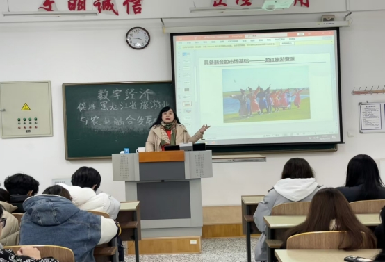 讲座中,韩海燕老师以“数字经济促进黑龙江省旅游业与农业融合发展研究”为主题,围绕“黑龙江省农业与旅游业实现数字融合的可行性”、“黑龙江省农业与旅游业实现数字融合的发展模式”及“黑龙江省农业与旅游业实现数字融合的发展举措”等内容为同学们细致耐心的讲解了黑龙江省数字经济促进旅游业与农业融合发展的可行性及必要性。讲座中提到产业关联度、龙江旅游资源、数字经济均使融合发展具备可行性,同时提出可通过唱响本土品牌,推动农旅融合产品升级、坚持诚信服务,筑牢区位和民族特色等举措推进融合发展。