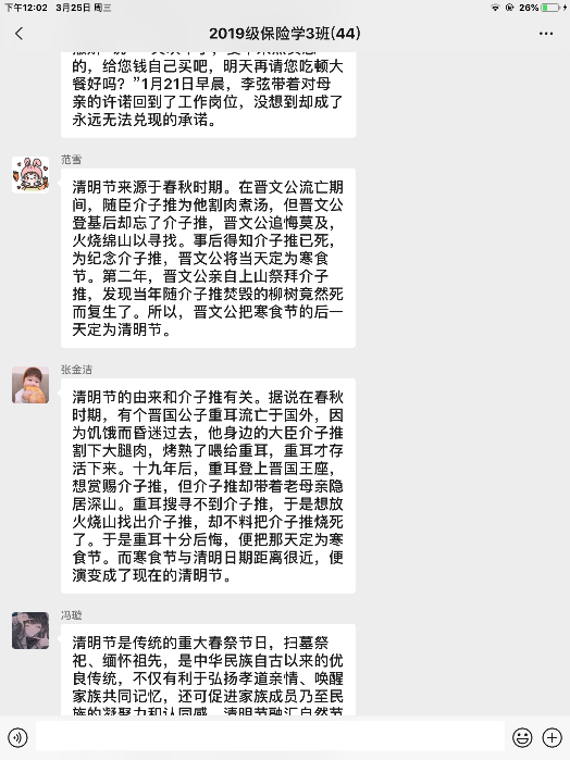 为积极响应号召,巩固防疫成果,进一步加强爱国主义教育,传承环保祭祀、文明缅怀的优良传统,投资保险系于2020年3月25日至27日组织学生开展以“我们的清明,文明缅怀”为主题的网络班会。
