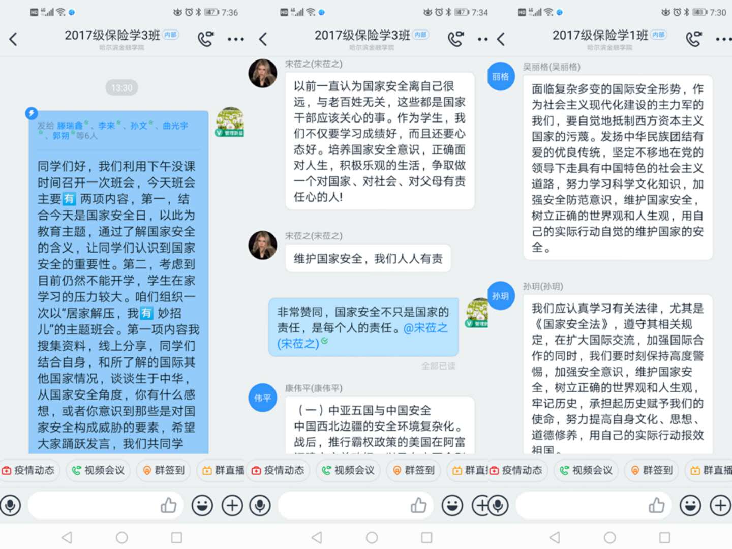 2017级辅导员董秀玲开展以“国家安全、你我同行”为主题的线上教育活动,2017级全体同学参加了活动。首先,组织学生了解“国家安全教育日”的来历及背景,通过钉钉群观看以“国家安全”为主题的宣传材料,引导学习《国家安全法》、《反恐怖主义法》等相关法律,了解国家安全的含义。结合疫情期间最美逆行者坚守岗位,舍小家顾大家,以实际行动捍卫国家安全的事迹,感受中国力量、中国速度、中国精神,激发学生爱国主义情感,提高学生自护自救能力。同学们纷纷表示要从现在做起、从自身做起,将国家安全的相关法规内化为自身行为,形成自觉行动,自觉抵制危害国家安全的言行,坚持总体国家安全观,统筹传统安全和非传统安全,为决胜全面建成小康社会提供坚强保障。