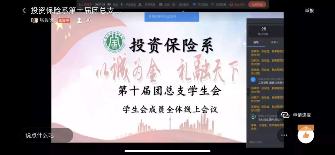 为充分调动学生干部工作积极性,营造良好的线上学生工作氛围,5月6日下午,投资保险系召开了团总支学生会“云”会议。团总支学生会全体成员通过钉钉平台参与了会议,团总支副书记忻小楠、学生会主席张俊逸分别主持了会议。