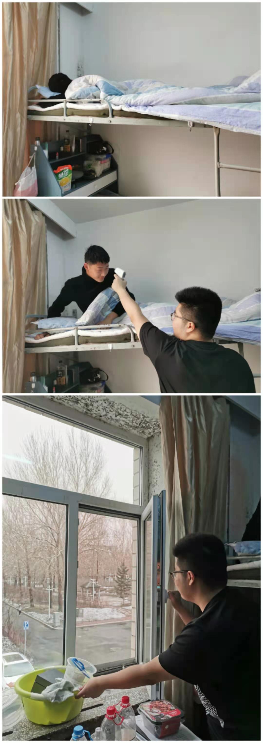 场景三:以寝室为单位进行突发情况应急演练。在寝室中,有人感到不适时,首先,寝室长立即告知所有成员不要慌乱,所有人佩戴口罩并进行测温。随后,打开寝室门窗,及时做好寝室通风。不适者向辅导员老师报告,如实反映情况,便于老师掌握状况,并自行前往校医院就医。最后,寝室长安抚寝室成员情绪,做好寝室内消毒工作。