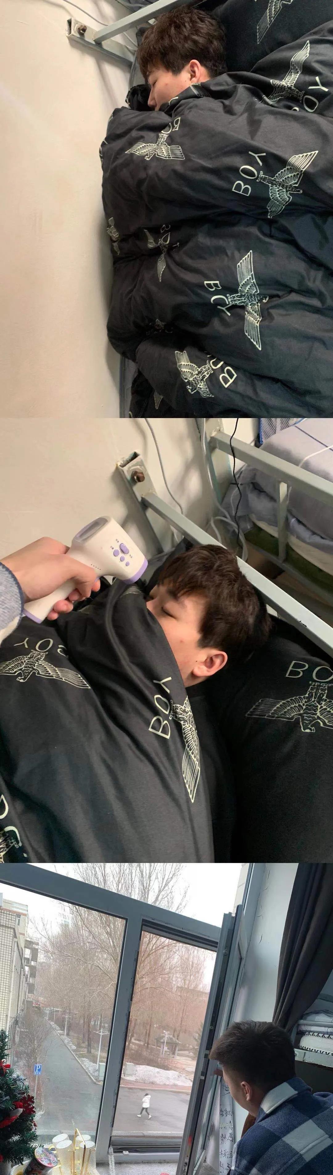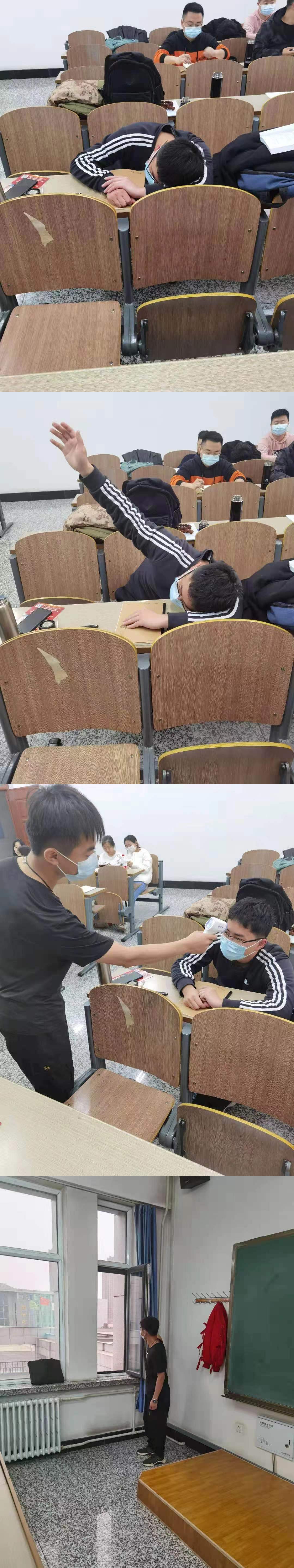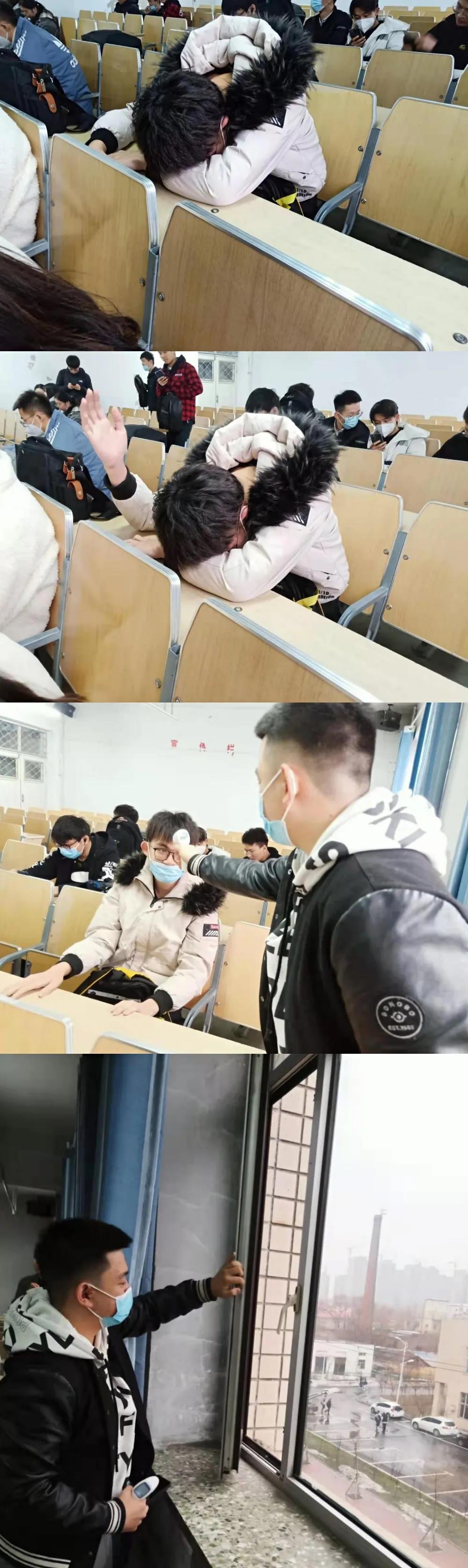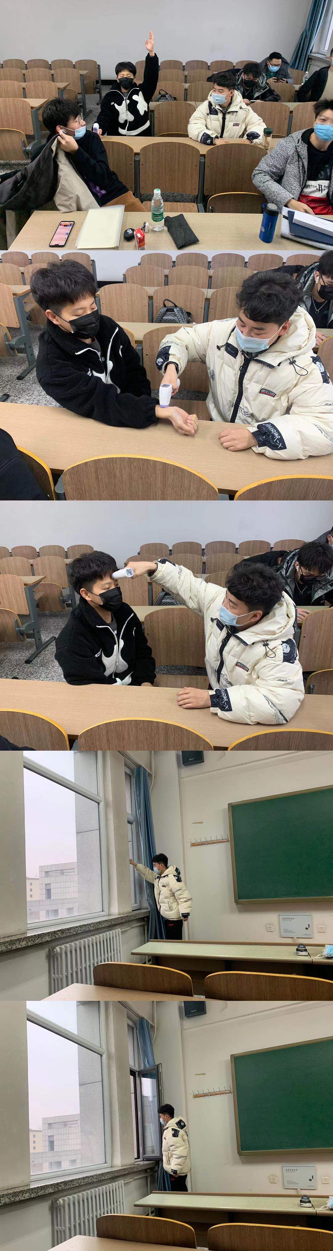 场景四:以班级为单位进行突发情况应急演练。在课堂中,学生感到不适时,立刻举手报告,老师停止授课,班长立刻对该同学进行体温检测,不适者立刻向辅导员老师报告情况,临近窗口的同学开窗通风,不适者立即前往校医院就医。其他同学听从老师安排,在教室内继续上课。