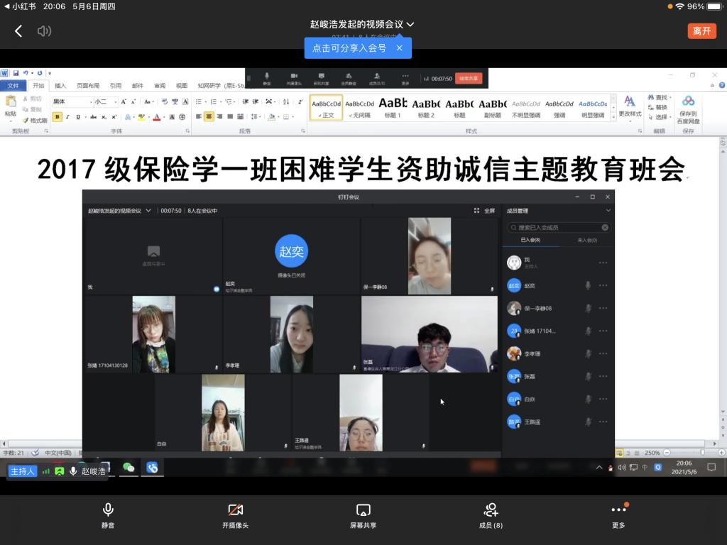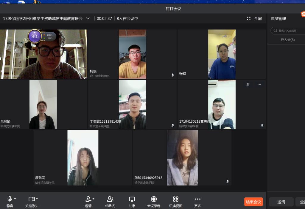 第二,活动过程。2017级由各班班长主持召开钉钉会议。在会议上,班长向同学们传达了本次活动的目的与主旨,希望通过此次活动,能够与同学们搭建一个沟通的桥梁,帮助同学们提高诚信意识、金融意识、风险意识以及法律意识,努力将大学生培养成为有责任、有担当、有理想、有信念的新时代青年。