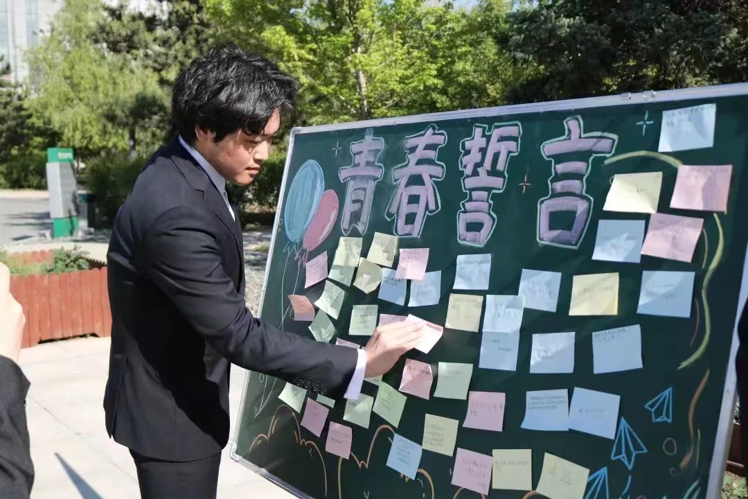 在慷慨激昂的歌声后进行活动第四项,学生纷纷在彩纸上写下自己的青春誓言,有序地将手中的彩纸粘贴到展板上!