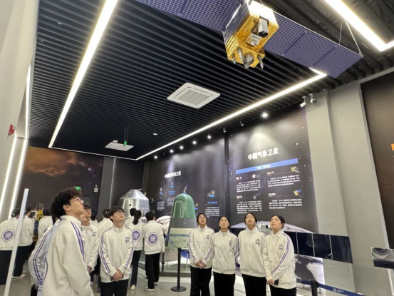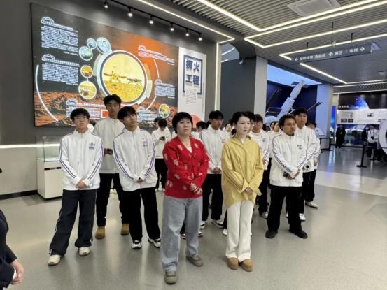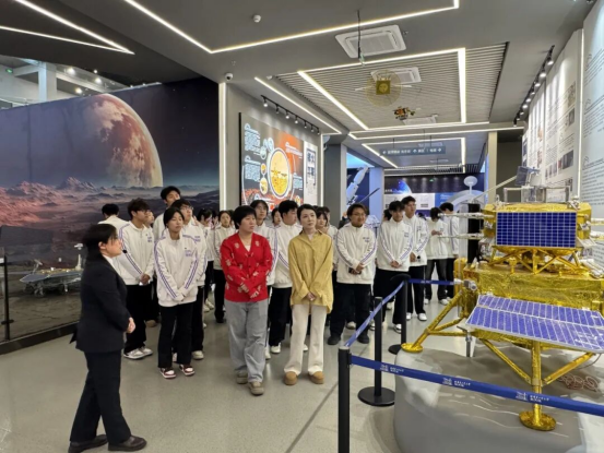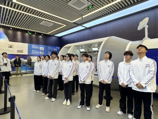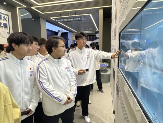 活动伊始,师生跟随讲解员步入哈尔滨工业大学航天馆。馆内巍峨的长征系列运载火箭模型巍然矗立,各类卫星、返回舱等实物陈列庄重肃穆,将团员青年带入我国航天事业波澜壮阔的历史场景。在讲解员的导引下,团员青年沿“航天历程”主线展区依次参观。从“东方红一号”划破寰宇的第一缕电波,到载人航天工程一次次圆满成功的辉煌时刻;从嫦娥探月“绕、落、回”的稳健步履,到北斗导航系统全球组网的卓越成就,团员青年驻足良久,深刻体悟到航天科技工程攻坚克难、勇攀高峰的精神内核。随后,团员青年跟随讲解员来到“哈工大贡献”专题展区,丰富详实的科研实物、技术模型等一系列标志性成果,生动诠释了高校为国家战略科技力量的重要组成部分所发挥的关键支撑作用。从筚路蓝缕的创业艰辛到举世瞩目的辉煌成就,宛如一次跨越时空的精神对话,使团员青年深刻体悟到“特别能吃苦、特别能战斗、特别能攻关、特别能奉献”的载人航天精神的实质内涵。