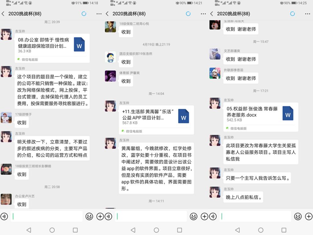 为增强学生创新意识,激发学生学习热情,锻炼学生逻辑思维能力,在前期组织学生参加大学生“挑战杯”大赛、组织学习培训活动的基础上,本周辅导员左玉帅和于佳对参赛学生提交的作品进行了一对一的有效指导,为学生认真修改作品,提供有针对性的意见和建议。鼓励学生参加大学生系列科研项目比赛,有利于开拓学生眼界,培养创新思维,锻炼组织和协调能力,同时还有利于提高团队协作能力,增强创新创业意识。