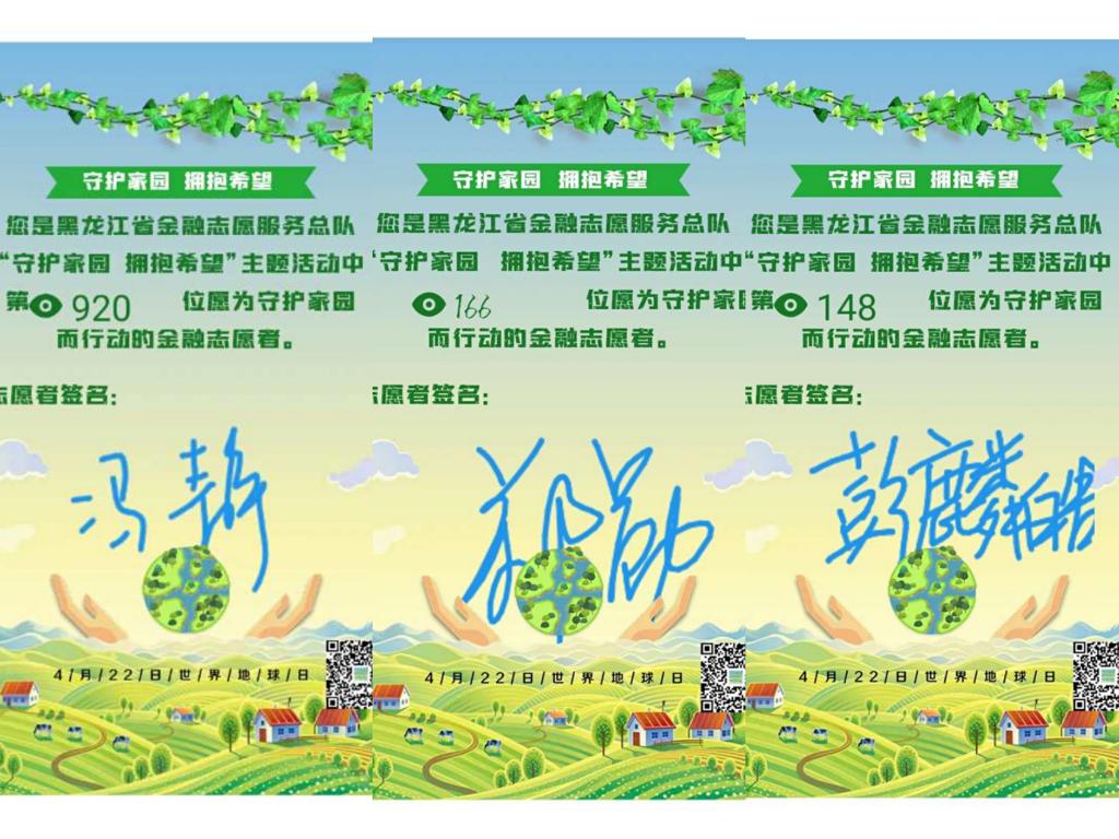2020年4月22日是第51个“世界地球日”,为积极响应党中央号召,共同抗疫、保护地球,我系组织学生参与了由黑龙江省金融志愿服务总队下发的以“珍爱地球,人与自然和谐共生”为宣传主题的“守护家园、拥抱希望”线上志愿活动。我系志愿者700余人为守护家园积极参与种树行动,互相分享守护宣言,签下自己名字成为守护家园而行动的金融志愿者,为地球增添希望,贡献自己的力量!同时发起“保护地球、人人有责”的倡议,号召大家应该从身边小事做起,保护自然、珍爱环境!此次线上活动,不仅使学生认识到尊重自然、保护环境的重要性,还增强了大学生的责任感和使命感,为守护家园贡献自己的力量!