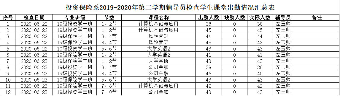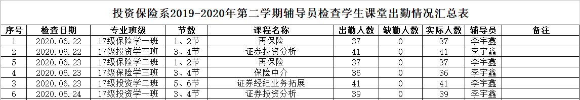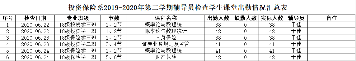 为积极响应学院号召,进一步落实学风建设工作任务,保障线上教学质量,营造良好的网络课堂环境,调动学生学习积极性,根据学院《关于进一步加强学风建设的意见》要求,投资保险系积极落实本系《学风建设工作实施方案》,现将第十七周关于推进学风建设工作汇报如下: