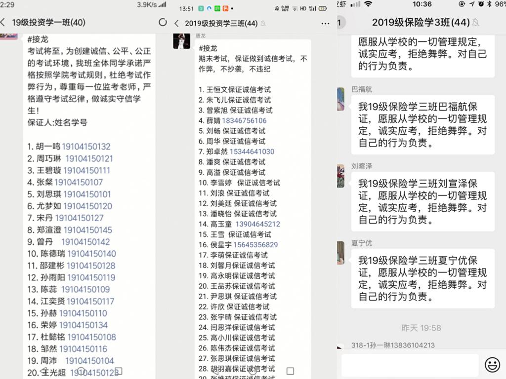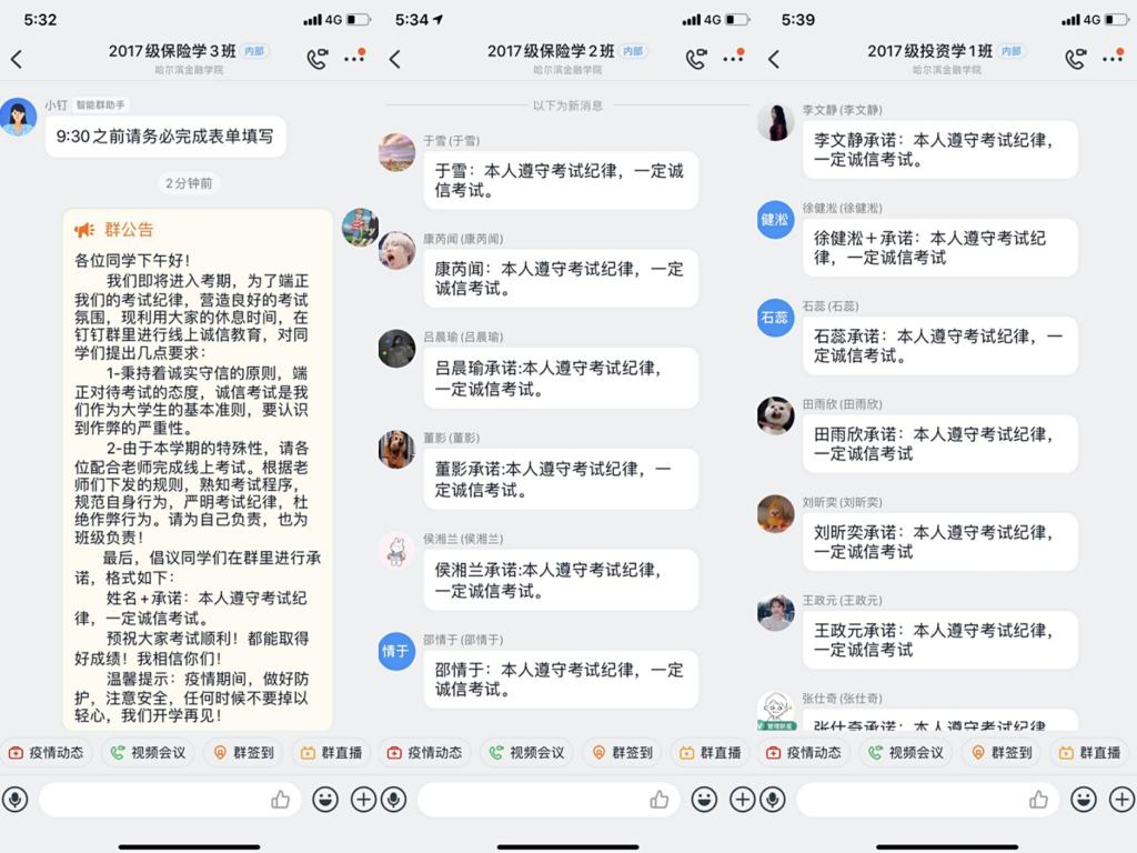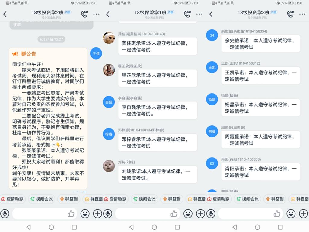 为加强学风建设,端正学生考试态度,形成良好诚信之风,6月22至24日,我系组织开展了期末考前诚信教育活动,三个年级近730名学生参加。各年级辅导员通过钉钉和微信平台进行了线上诚信教育。活动中,辅导员强调,要认真备考,诚信考试,诚实做人,严格自律,杜绝作弊行为,明确线上考试程序,熟记考生须知,要积极配合老师完成线上考试。随后发出倡议,同学们在线上进行了考前本人诚信考试承诺。最后,辅导员对学生给予鼓励,预祝大家取得好成绩。通过此次线上活动,使学生充分认识到诚信考试的重要意义,帮助学生增强自信,进一步加强了学生思想教育引导,有利于我系形成良好学风。