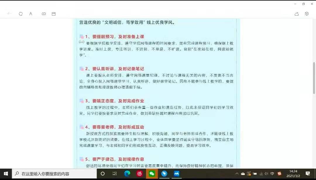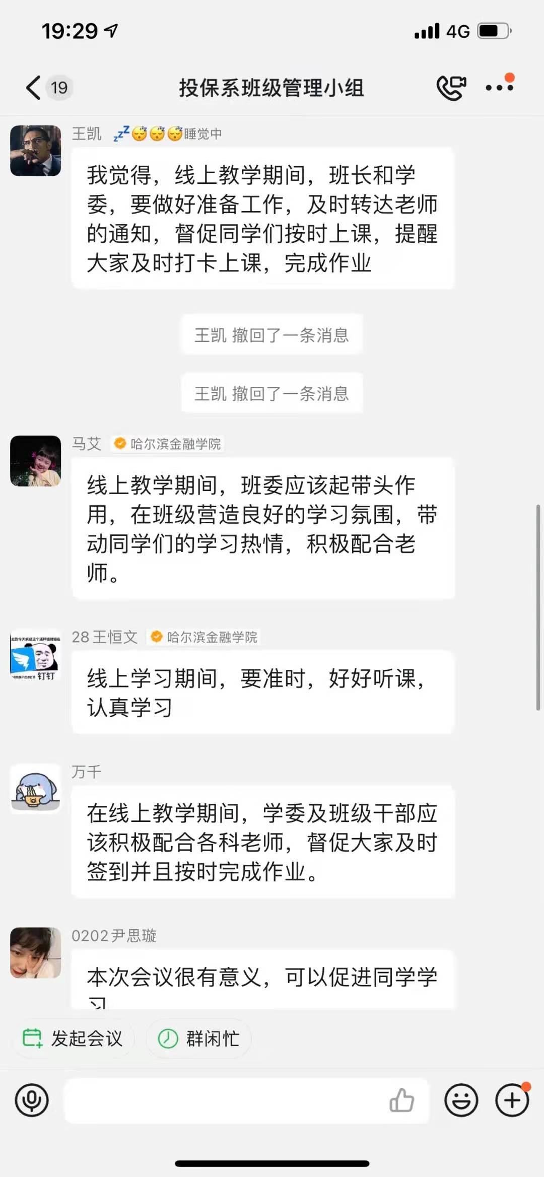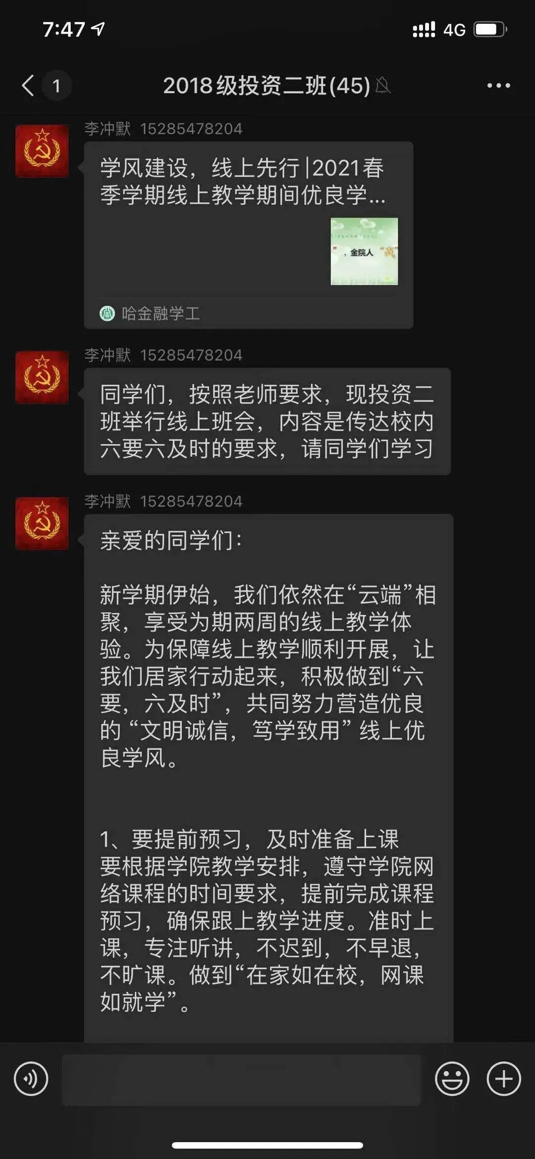 各班通过钉钉和微信平台开展了“学风建设、线上先行”线上主题班会,学生干部积极发挥榜样带头作用,号召班级同学要做到“六要、六及时”,在线上学习中,要实现“三要,四做到”。一要养成积极的学习心态、找到高效的学习方法;二要制定明确的学习计划、置身良好的学习环境;三要全面贯彻老师的教学方针、及时沟通合作及反馈。做到提前预习、准备上课;做到认真听讲,记录笔记;做到端正态度、完成作业;做到尊重老师、形成互动。随后,班长发出倡议,呼吁大家学好专业知识,树立学习典型,互相交流学习方法,共同进步,提高专业素养。同学们纷纷表示要坚持做到在家如在校、网课如就学,停止拖延、高效学习,将笃学致用的优良学风践行到线上学习中。