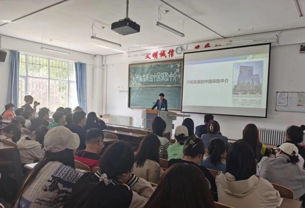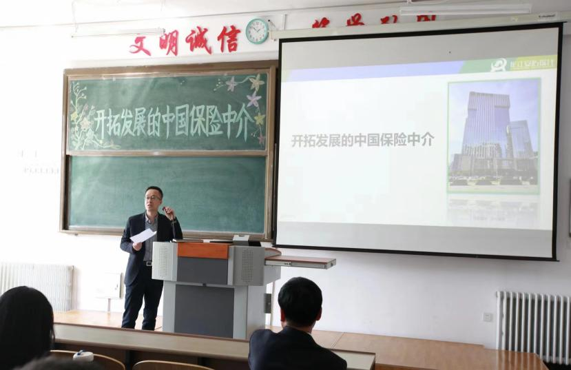 殷灿江董事长首先结合自身工作经历,讲解并启发学生们对未来就业展开思考,其次为同学们讲解了保险行业广阔发展的前景,客观分析了保险代理行业给个人发展带来的机会,随之对于龙江安心保代公司进行了介绍,最后就学生实习、就业选择给予了专业的建议,使同学们坚定了对未来从业的信心。