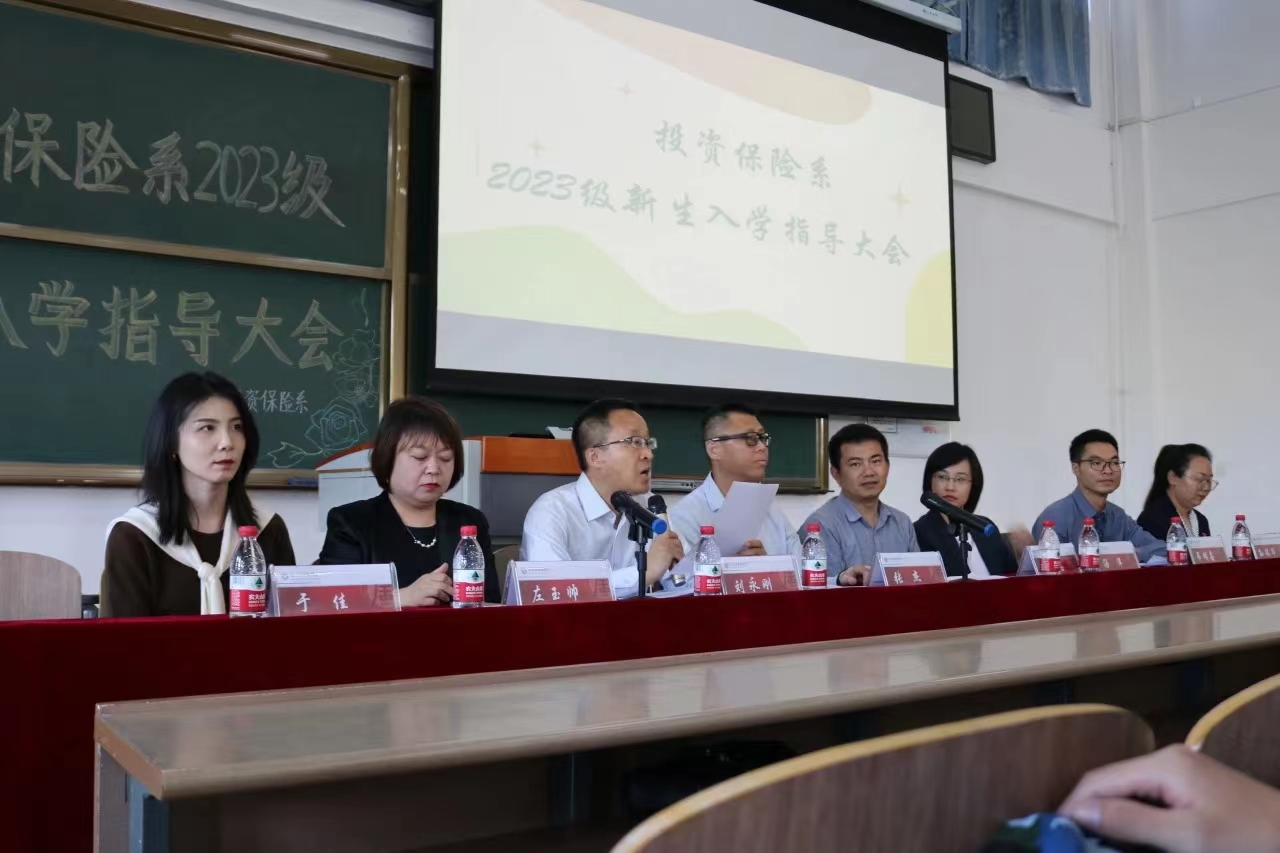 投资保险系党总支书记张杰、主任王立志、投资学教研室主任汤洋、优秀毕业生代表韦明喜和孙瑞华、2023级辅导员左玉帅、团总支副书记于佳及2023级全体新生出席了本次会议,会议由系党总支副书记刘永刚主持。