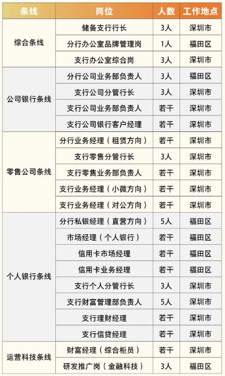 截至目前,深圳分行共设立营业部、龙岗支行、南山支行、宝安支行、龙华支行、后海支行、罗湖支行、财富港支行、坂田支行、科技园支行、光明支行、前海支行、华强北支行、坪山支行、盐田支行、西丽支行、梅林支行、香梅社区支行、红荔社区支行、大鹏社区支行等20家分支机构,营业网点遍布深圳各个行政区。