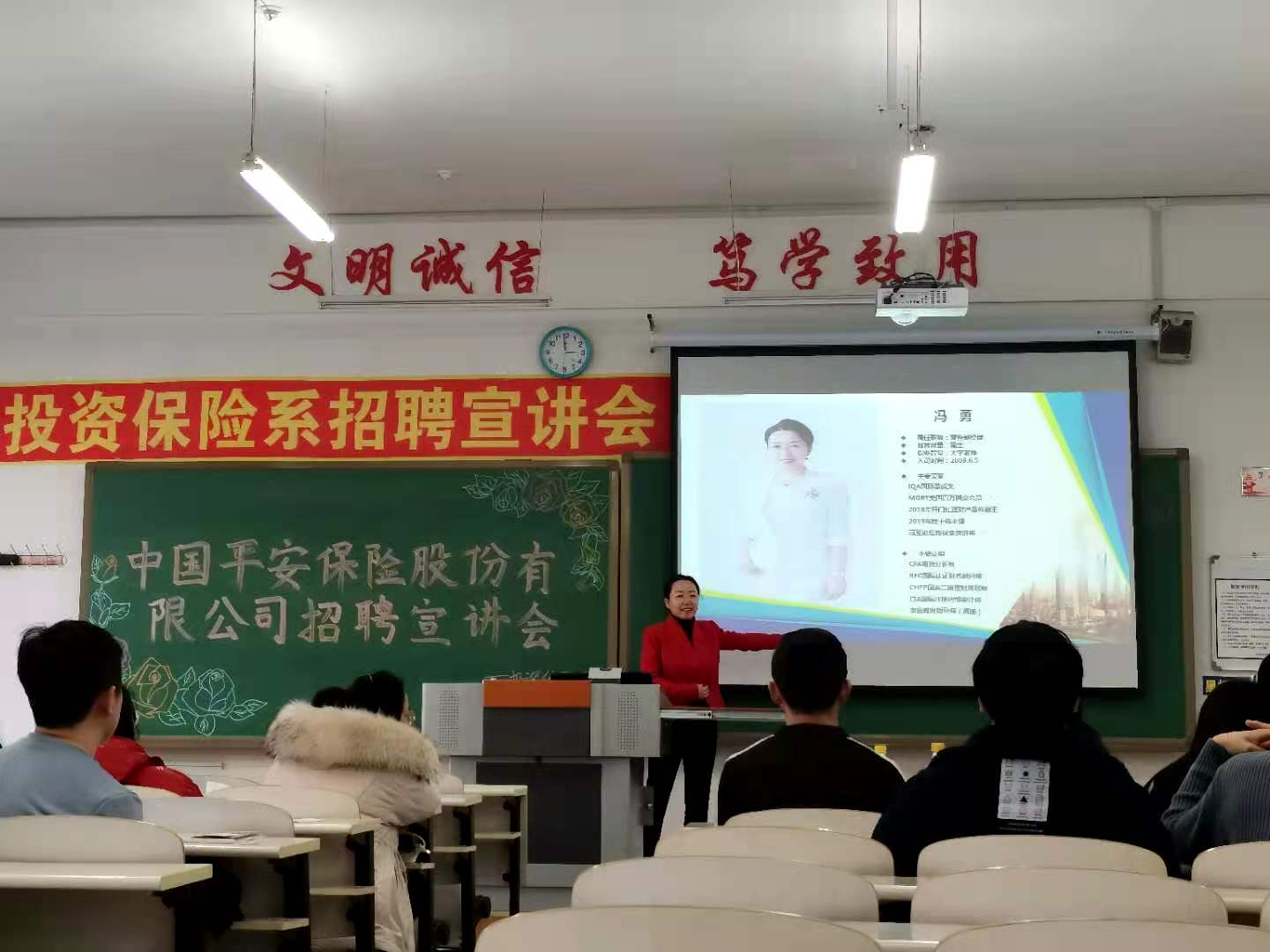 为了帮助同学们了解行业前沿动态,搭建良好的就业平台,树立正确的就业观与择业观,投资保险系于2020年11月11日15:00在综合楼106联合中国平安保险公司黑龙江分公司召开招聘宣讲会,我院2021级部分毕业生参加此次招聘宣讲会。