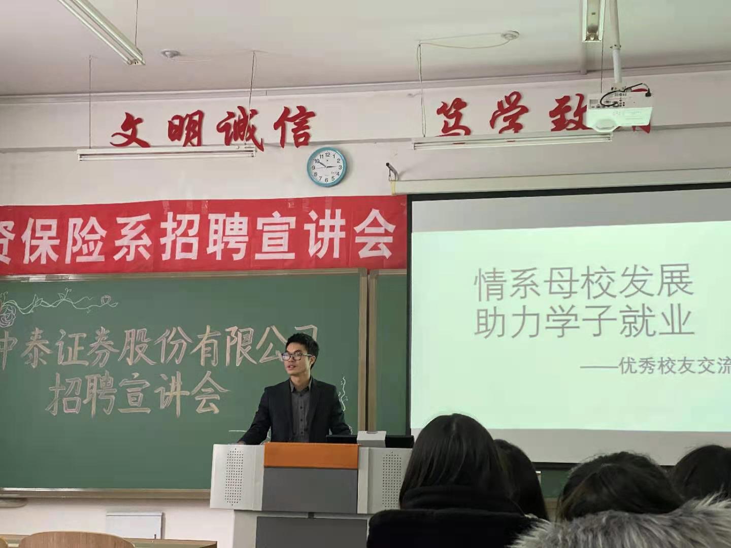 宣讲会上,首先由我系的毕业生韦明喜向应届毕业生分享了一些自己的感受和自己过往的经历,和大家交流了投资,基金,证券等等的证件的重要性,讲述了中泰公司的排名和实际控制人以及各类保险公司的形式与行情。