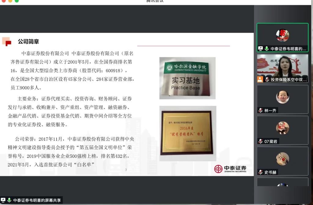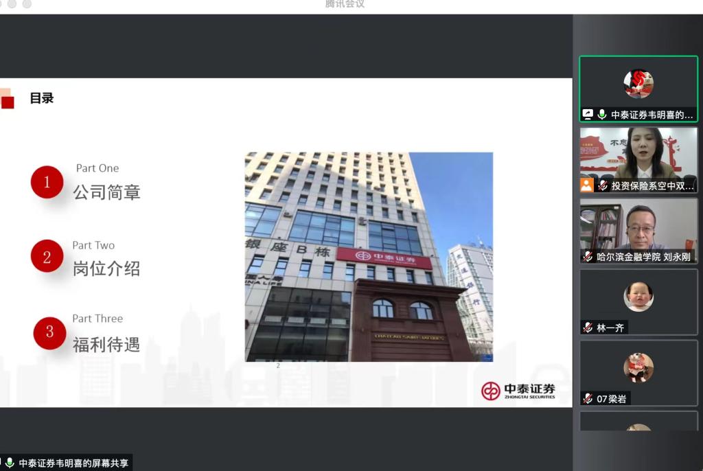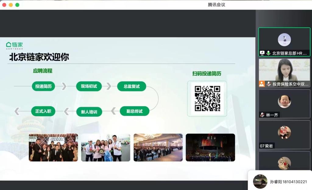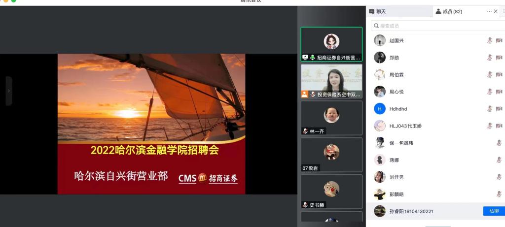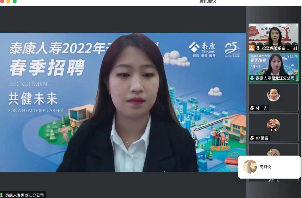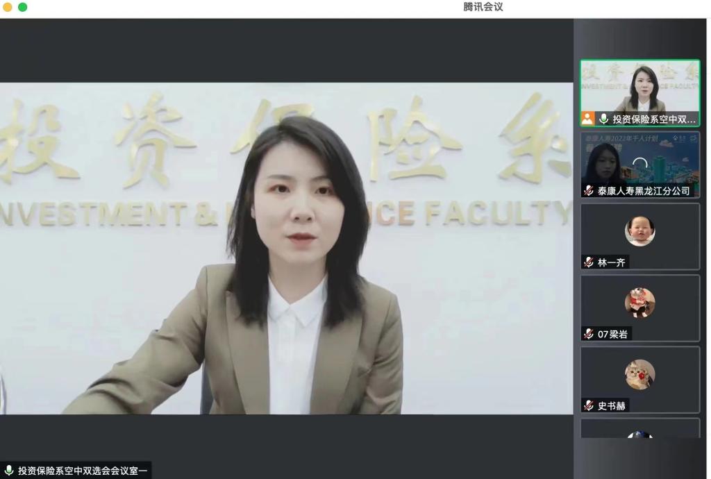 为全力促进我系毕业生顺利就业,抢抓毕业生离校前求职关键期,开拓更多就业岗位和机会,搭建用人单位与学生交流平台,根据《黑龙江省教育厅关于印发2022届高校毕业生就业促进周开展“百日冲刺”系列活动的通知》文件精神,经过前期近半个月的筹备,2022年5月25日,投资保险系举办了2022届毕业生空中双选会。会议邀请10家用人单位通过腾讯会议平台线上进行。系党总支书记张杰、党总支副书记刘永刚、10家用人单位宣讲负责人以及2022届未就业毕业生近百人参加了本次双选会。会议由投资保险系2022届辅导员于佳主持。