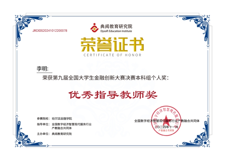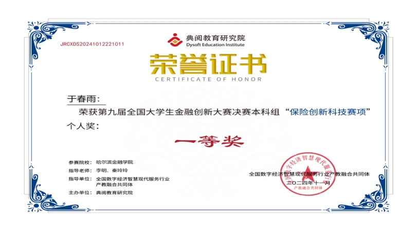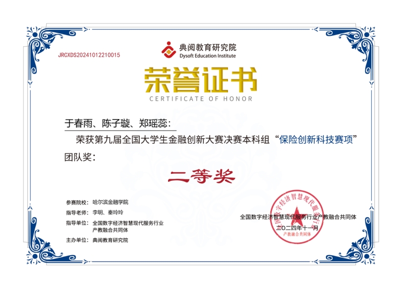近日,第九届全国大学生金融创新大赛成功举办,全国共有290所高校,近三千余人参加比赛。我院保险学专业学生不畏强手,过关斩将,在大赛中脱颖而出。保险学专业学生2021级于春雨、2022级陈子璇荣获“保险创新科技”赛项本科组个人全国一等奖,“保险之星”团队荣获该赛项团队全国二等奖,全国排名第15名,东三省赛区第1名,指导教师李明、秦玲玲荣获优秀指导教师称号。