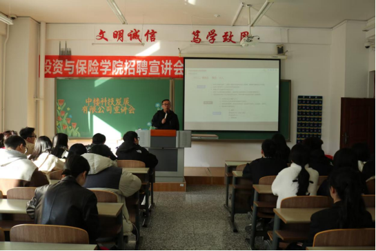 为进一步拓宽我院毕业生就业渠道,精准对接优质岗位资源,切实提升毕业生就业质量与就业竞争力,2025年10月13日,投资与保险学院联合中楼科技发展有限公司在综合楼115成功举办线下专场招聘宣讲会。中楼科技发展有限公司宣讲人刘彦超及我院2026届50名应届毕业生共同参与本次活动。