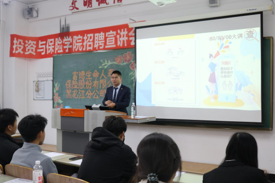 为活跃气氛富德生命人寿保险股份有限公司宣讲人康晓宇与在座的学生进行了互动提问。康晓宇为在场学生重点介绍了黑龙江省分公司作为其重要分支机构,于2006年成立,位于群力CBD金融中心,依托总公司的强大背景,具备坚实的发展基础。重点解读了2026届校园招聘计划,此次面向投资与保险学院学子开放多个核心岗位实习机会,明确岗位任职要求,优先考量金融保险相关专业背景,同时注重候选人的沟通协作能力与学习适应能力。此外,还详细介绍了公司“专业培训+职业导师”的人才培养体系、清晰的晋升通道及完善的福利保障制度,消除了学子们对职业发展的顾虑。