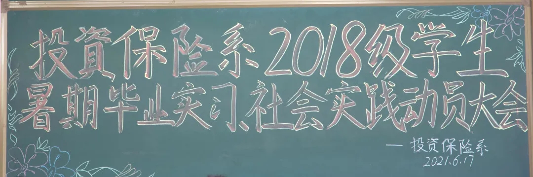 为进一步调动学生投身实习岗位的积极性,深化教学实习的基本目的和意义,帮助学生了解就业形势,明确毕业实习与社会实践的重要性,2021年6月17日,投资保险系在综合楼228召开2018级学生暑期毕业实习、社会实践动员大会。会议由系党总支书记张杰主持,教务处副处长南洋、投资保险系主任王立志、党总支副书记刘永刚、投保系全体教师及我系2018级全体学生参加了本次动员大会。