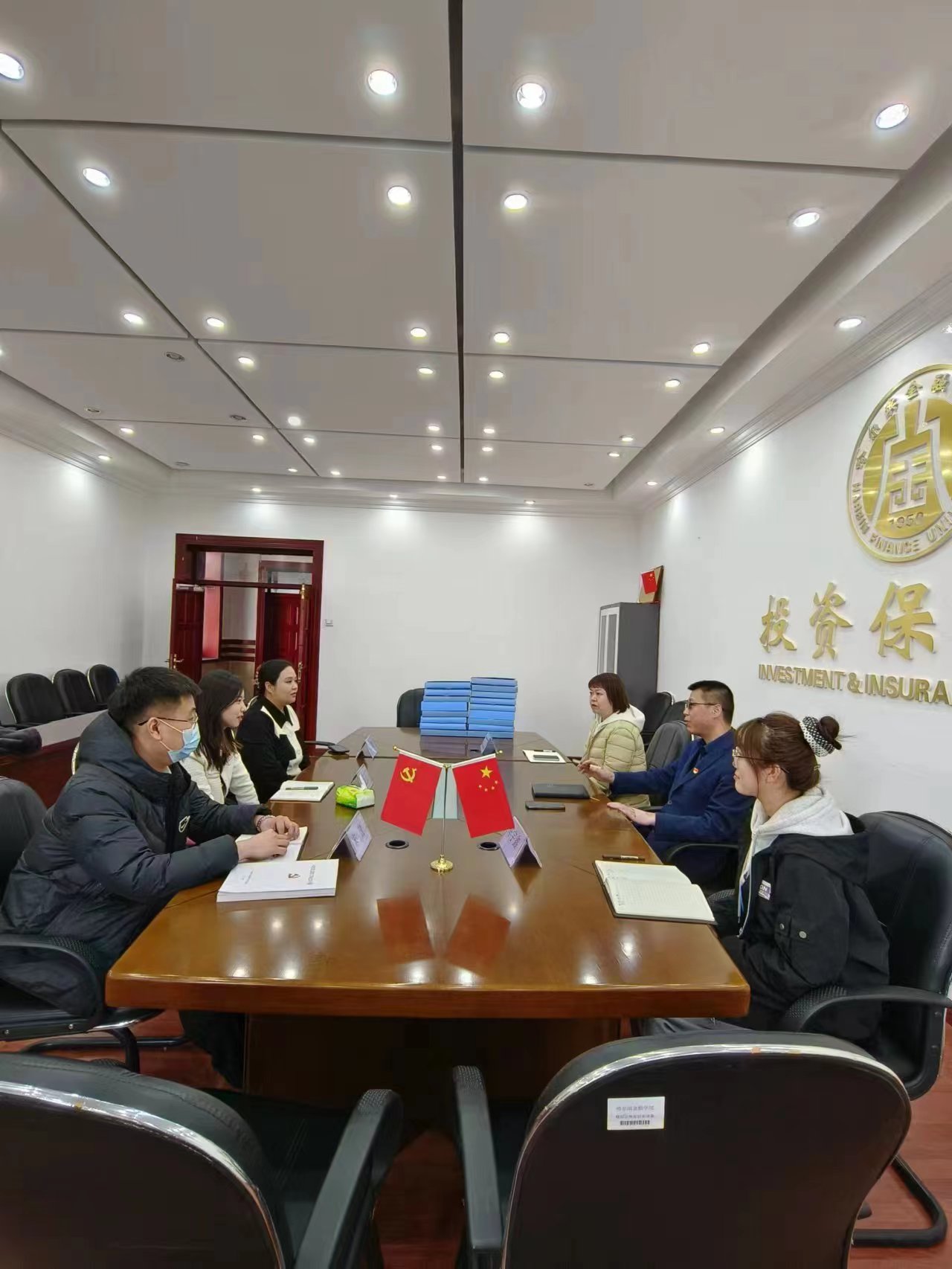 为深入学习贯彻党的二十大精神,认真落实新时代党的建设总要求,推动“结对共建”双方在党的建设方面有新的突破和提高,2022年3月23日下午,哈尔滨城市技术学院护理系行政副主任、学生第一支部书记周宏洋、教工支部书记蔡璐、学生第二支部书记宋健一行三人到我院投资保险系开展党建结对共建交流活动。投资保险系党总支书记张杰、学生第一党支部书记左玉帅、学生第二党支部书记李宇鑫参加了座谈交流。